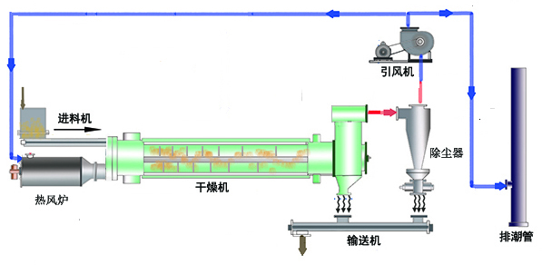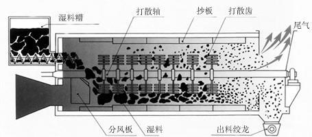 進入干燥器內(nèi)的濕物料被轉(zhuǎn)動的筒壁上的抄板抄起到頂部落下,在下落的過程中被破碎裝置打擊破碎,熱風從物料表面穿過進行傳熱和傳質(zhì)。大塊物料在反復(fù)抄起落下的過程中,不斷被打碎成小顆粒干燥,直至破碎成細小的顆粒,達到要求的水份排出;被熱風夾帶的細粉由收塵裝置收集。