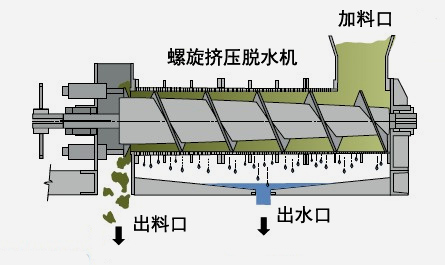 螺旋擠壓脫水機啟動后,需脫水的高濕物料從進料箱均勻加入,物料在螺旋旋轉葉片推動下沿軸向向出料端移動,在變化的螺距、螺桿和調節(jié)擋板的巨大的擠壓力作用下,物料完成機械脫水作業(yè)。水分通過篩網在出水口排出,脫水后的物料在出料箱處排出。對于物料品種的不同和產量的變化可通過調整脫水機實現(xiàn),達到脫水效果和產量的最佳配合。