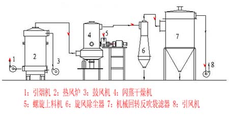 (1)旋轉(zhuǎn)閃蒸干燥機技術(shù)含量高,有機地結(jié)合了旋流,流化,噴動及粉碎分級技術(shù)。